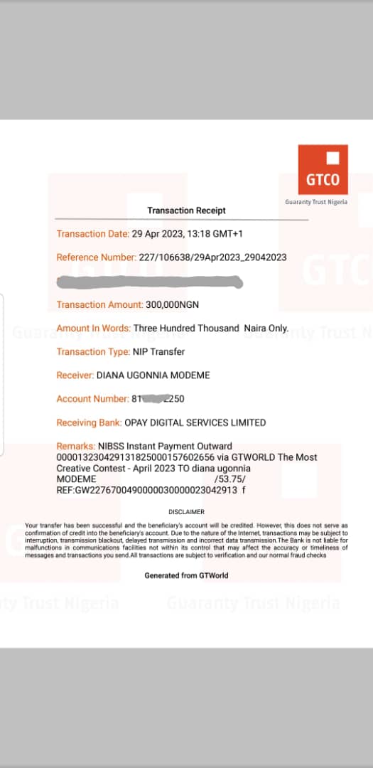 Here is a receipt of the transfer we made to Diana Modeme