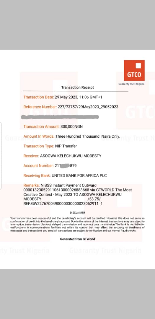 Here is a receipt of the transfer we made to Asogwa Kelechukwu