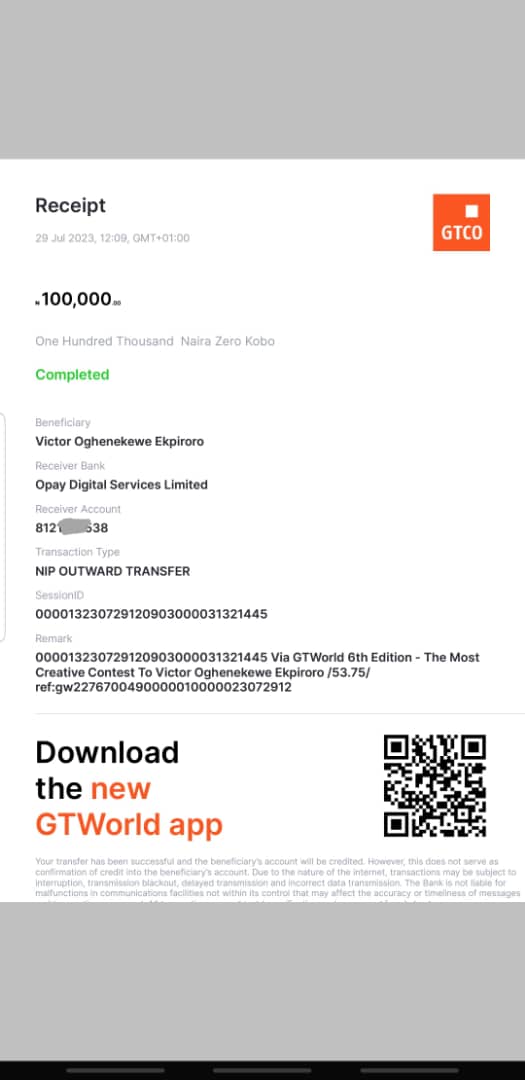 Here is a receipt of the transfer we made to Ekpiroro Victor Oghenekume
