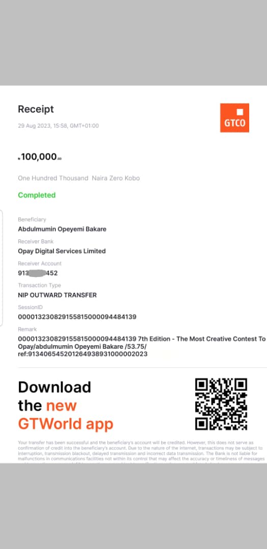 Here is a receipt of the transfer we made to Bakare Abdulmumin Opeyemi