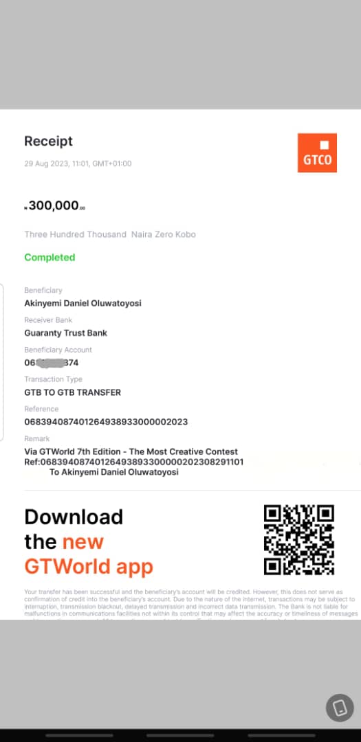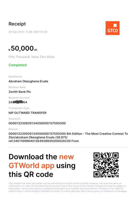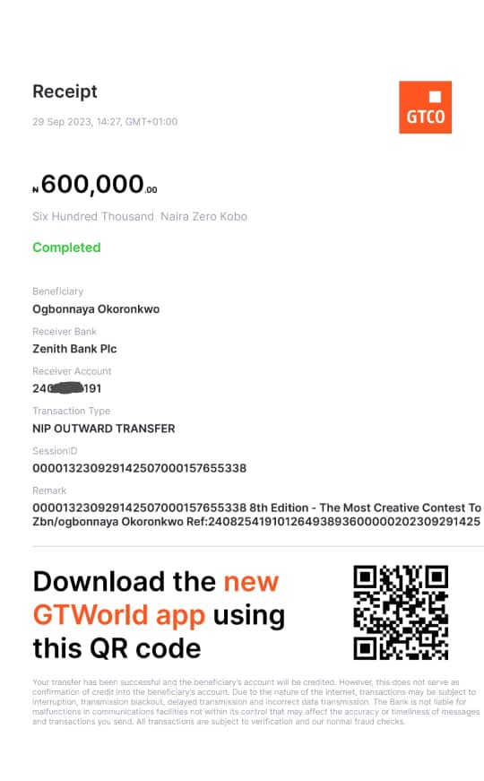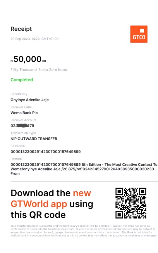 Here is a receipt of the transfer we made to Jeje Onyinye