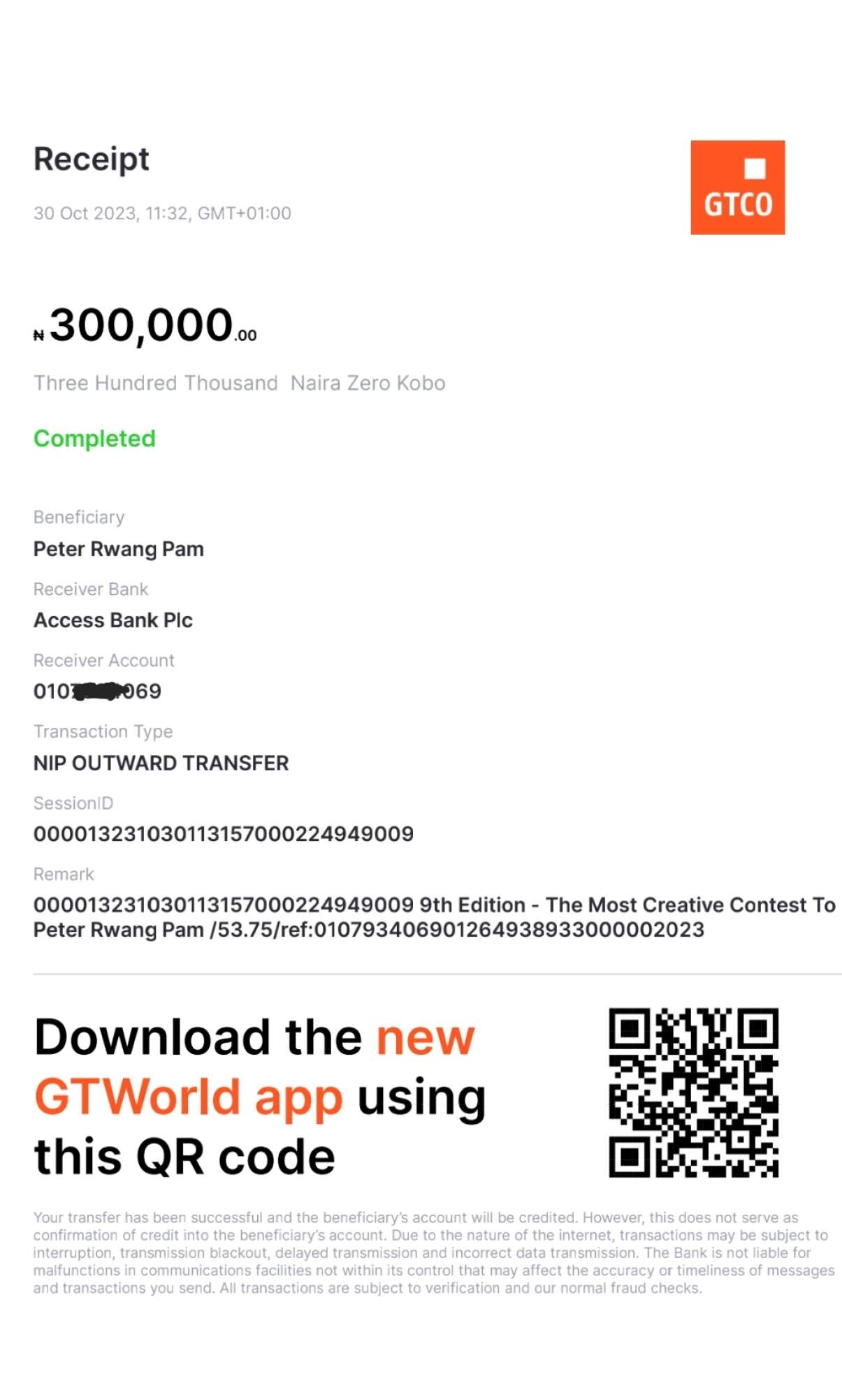Here is a receipt of the transfer we made to Teda