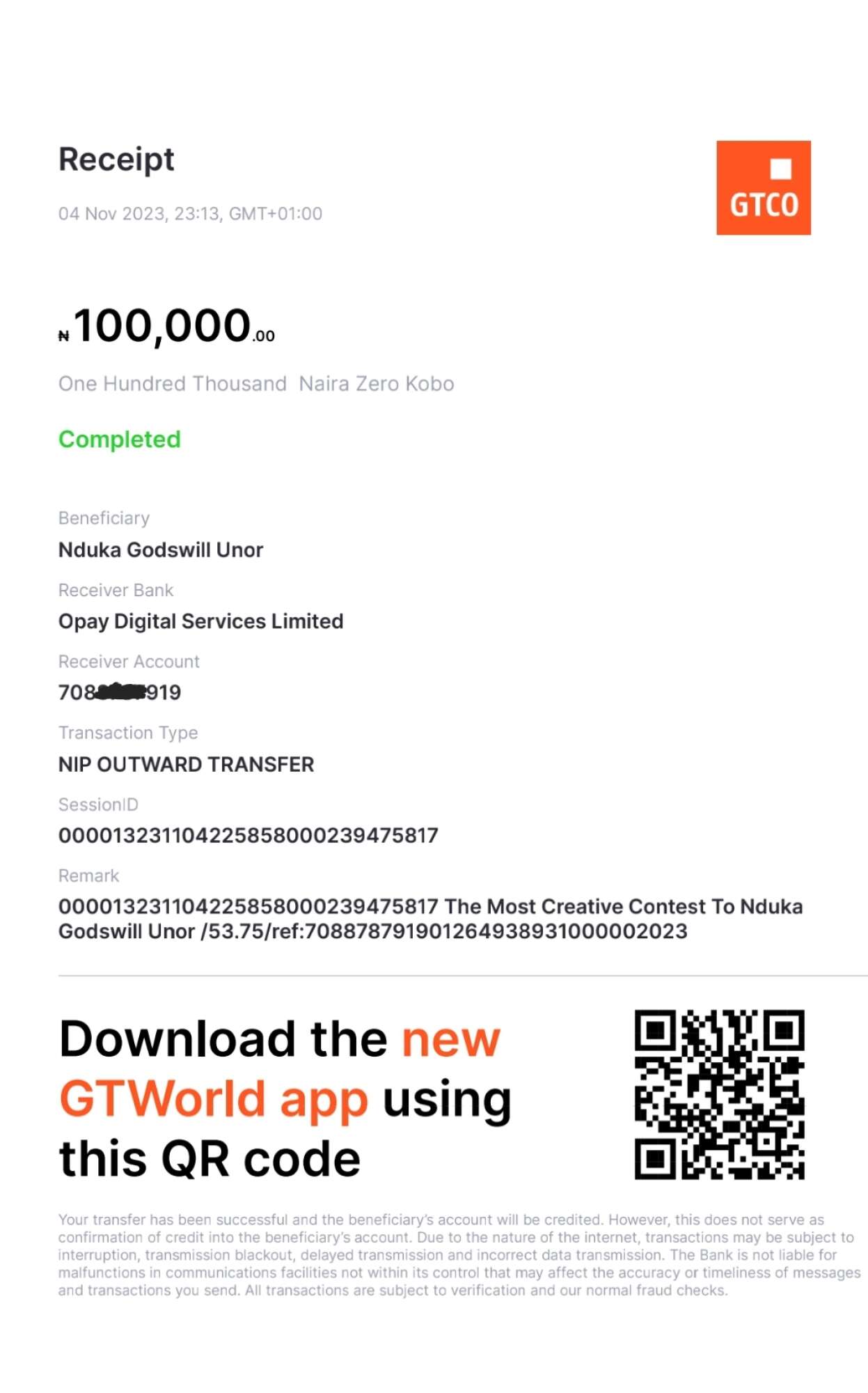 Here is a receipt of the transfer we made to Precious Jay